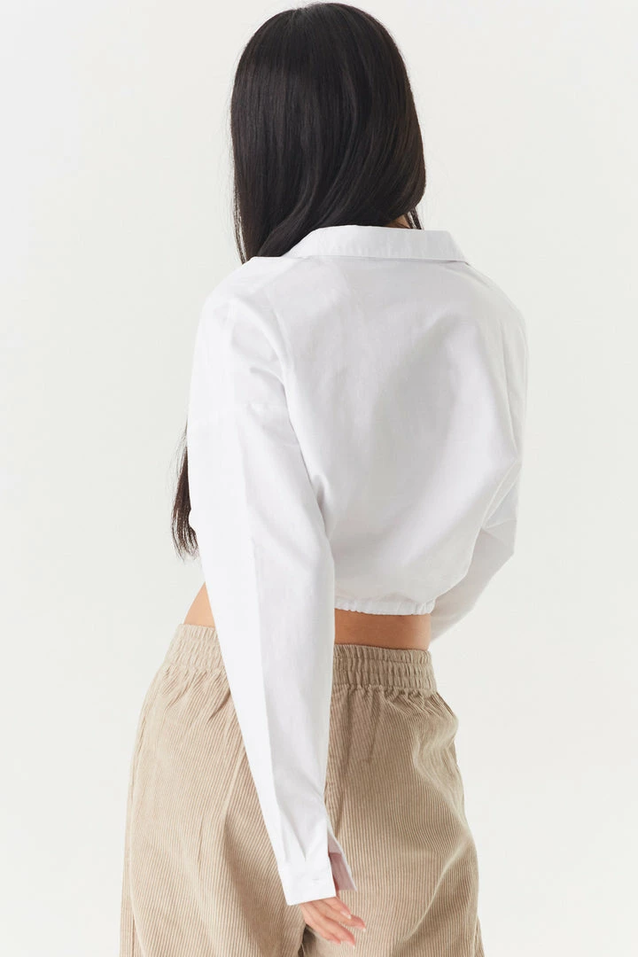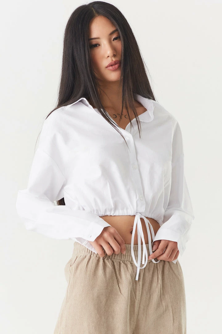 Re-energize your work look by adding a classic button-up top with a sexy twist. This top features a front button-up closure, Oxford collar, cinched hem with self-tie drawstrings, cropped length and long sleeves. Size Runs Small.