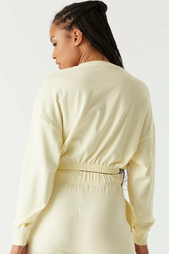 You deserve to chill in the softest lounge set! This top features a crew neckline, front graphic, elasticized cinched hem, soft fleece material, long sleeves and a cropped length. Size Runs Small. Complete the ‘fit with Soft Fleece Honey Graphic Jogger