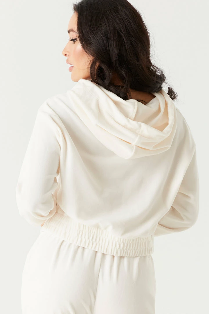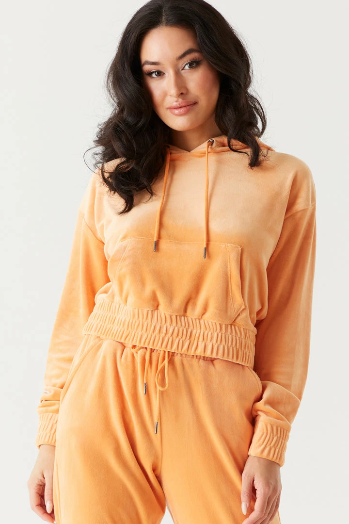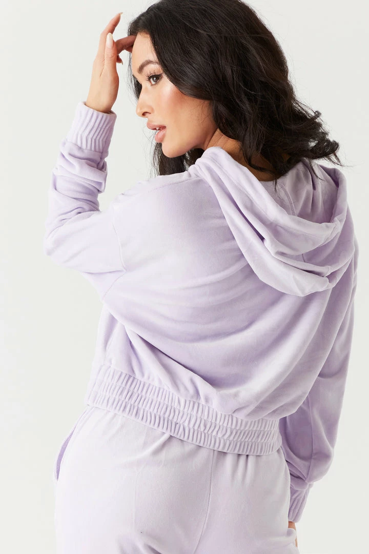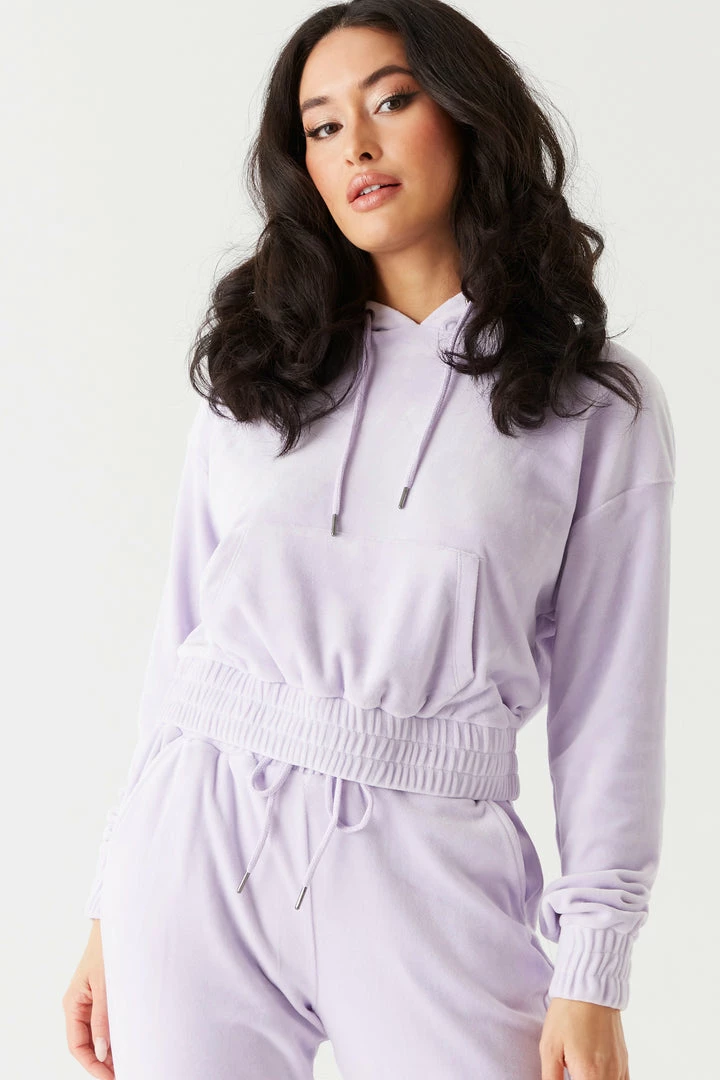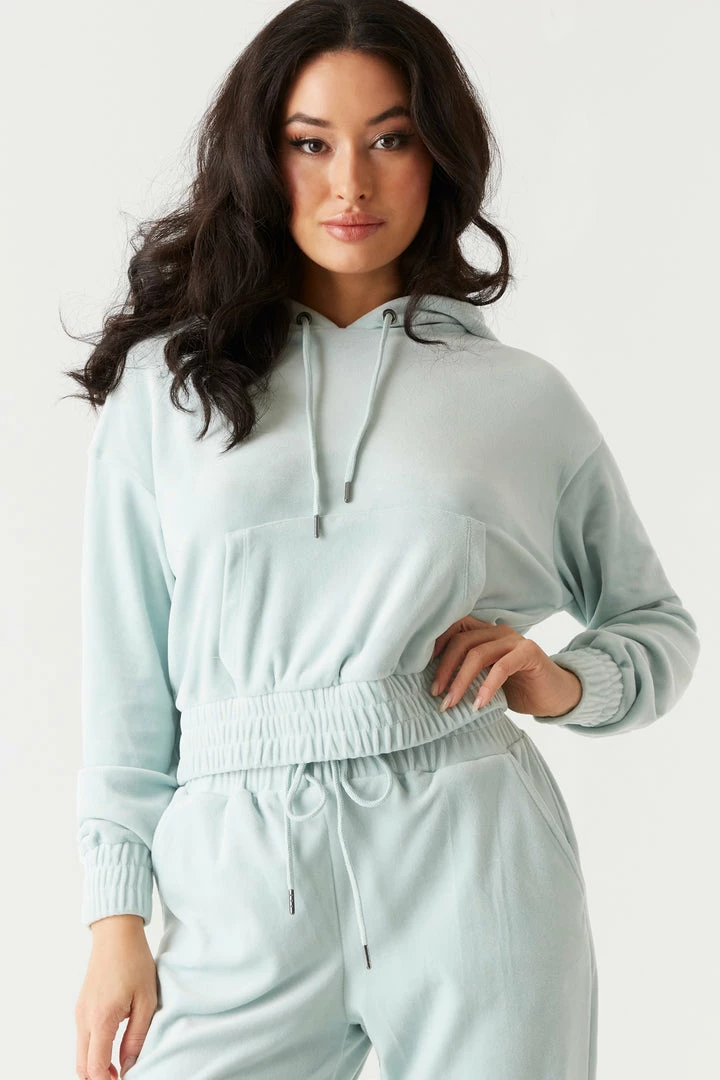 It’s time to take your hoodie collection to the next level with this luxurious velour piece. This hoodie features elastic cinched waistband, front kangaroo pocket, drawstring with hood and cropped design. Size Runs Small. Complete the look with the Soft Velour Cinched Ankle Jogger.