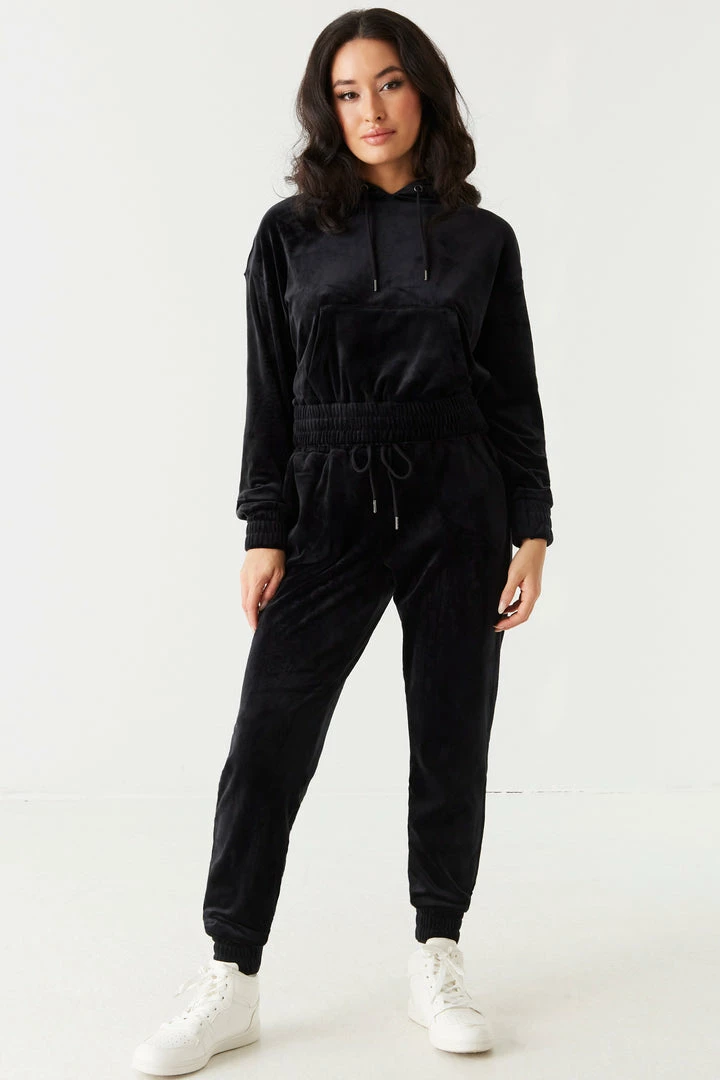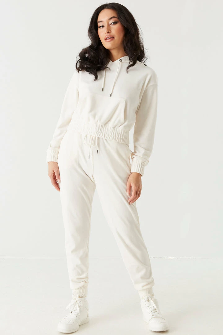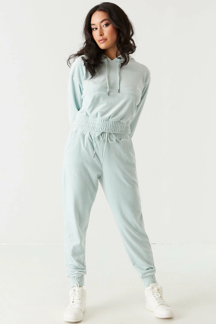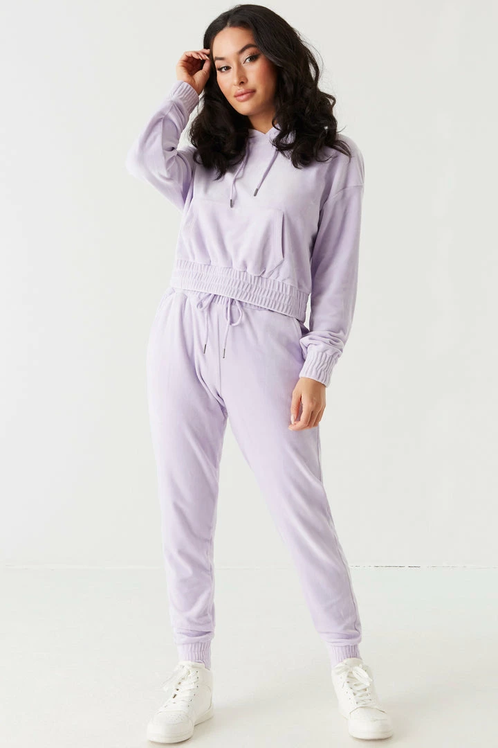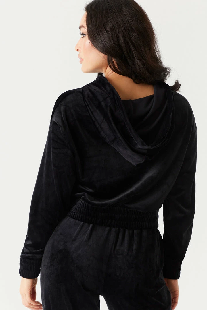 It’s time to take your hoodie collection to the next level with this luxurious velour piece. This hoodie features elastic cinched waistband, front kangaroo pocket, drawstring with hood and cropped design. Size Runs Small. Complete the look with the Soft Velour Cinched Ankle Jogger.