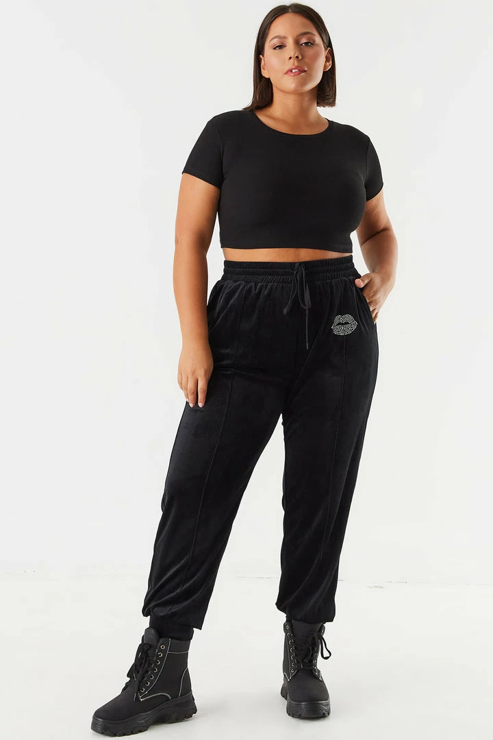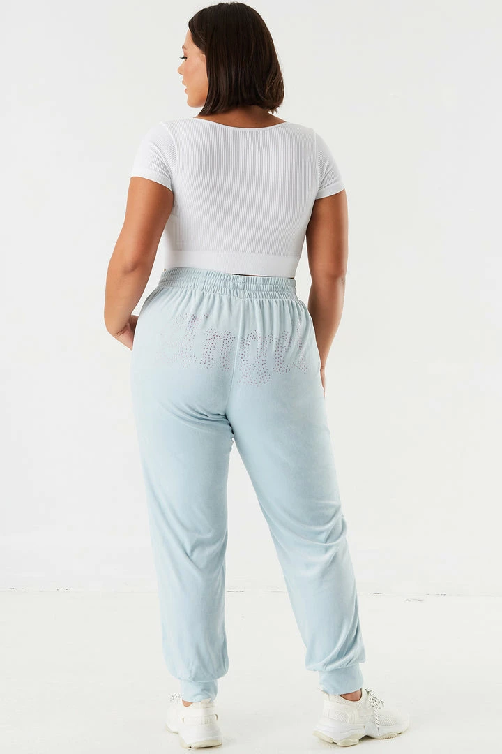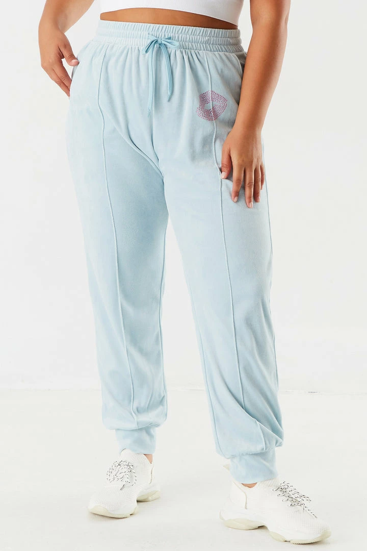 We’re throwin’ it back to the iconic velour sets! Sport them like it’s the year 2000. This jogger features a comfortable elasticized waistband with adjustable drawstrings, soft velour material, rhinestone or embroidered graphics, two side pockets and cuffed bottoms. Size runs small.