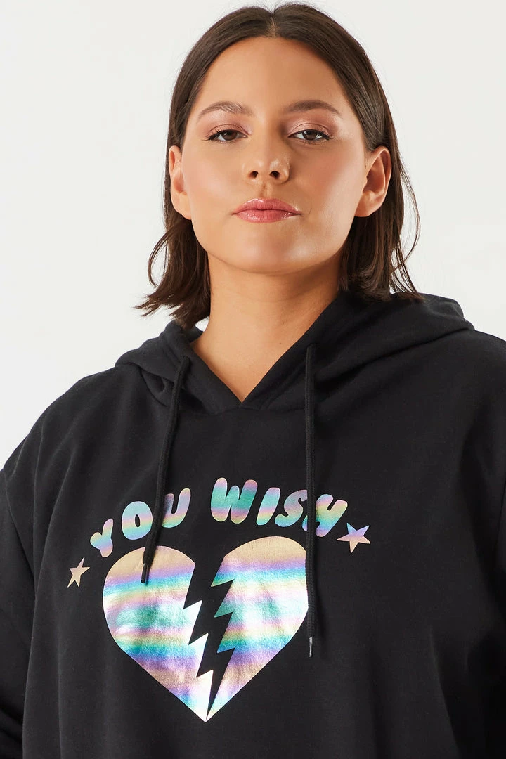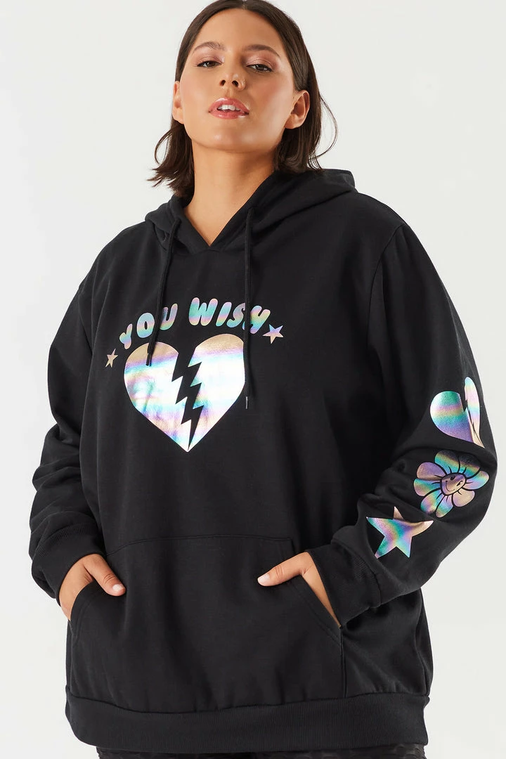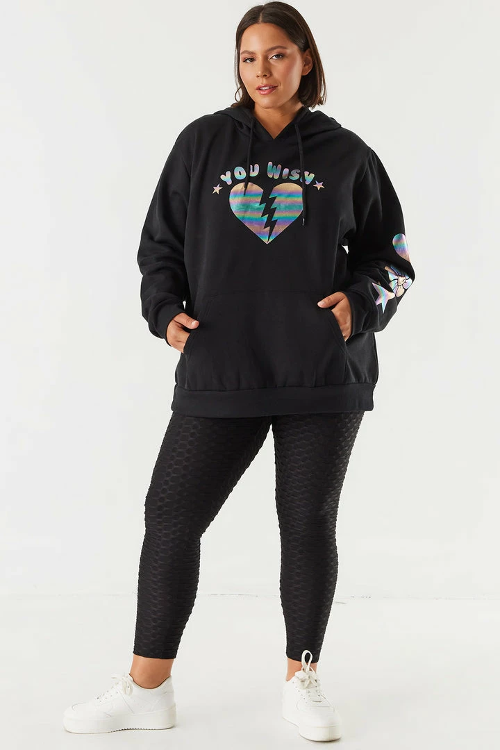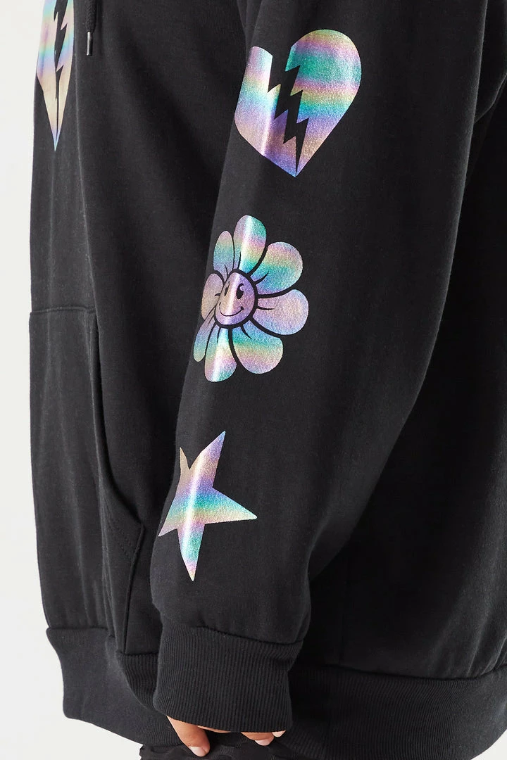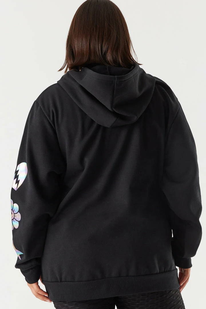 This hoodie is ready for all your errands or chilling at home. This hoodie features a fleece interior, front, sleeve and back graphics, hood, front kangaroo pocket, relaxed boyfriend fit and ribbed cuffs and hem. Size runs small.