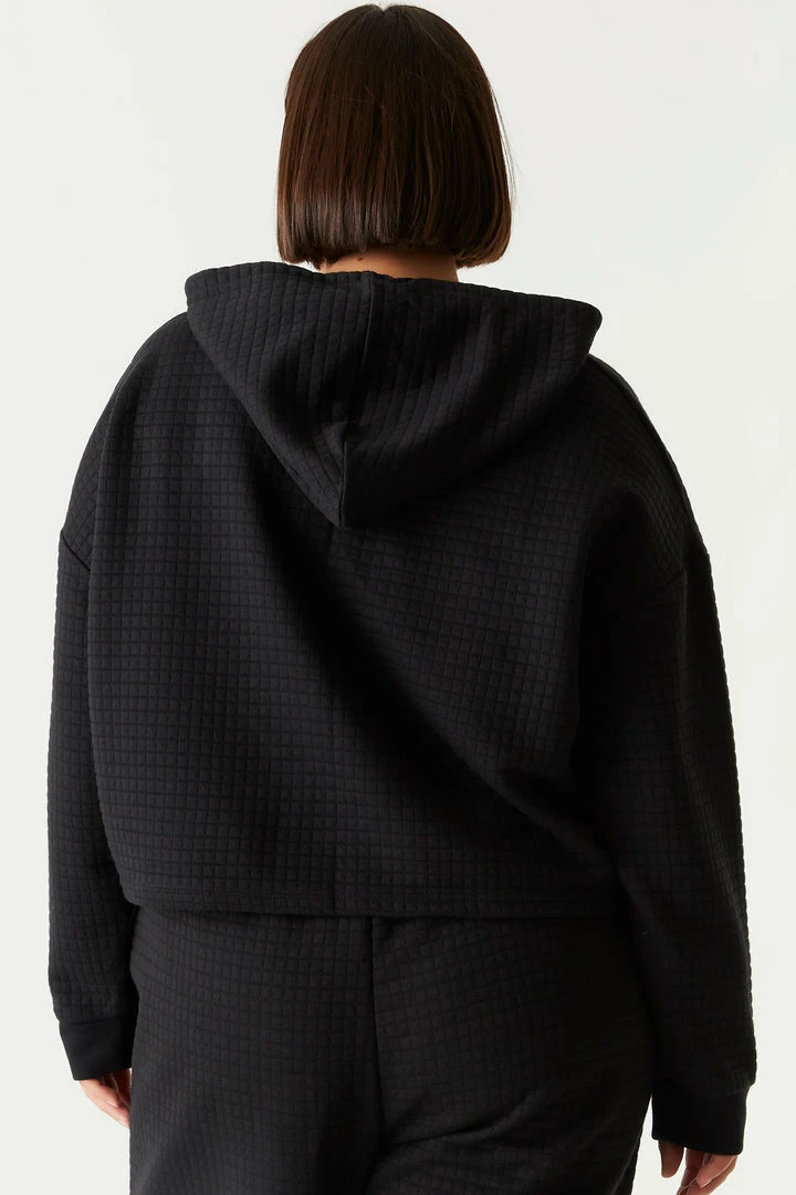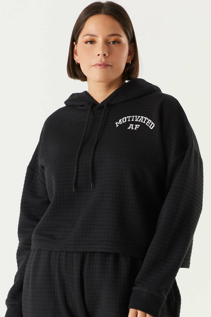 You’ll never feel quilt-y for wearing a hoodie! This cute hoodie will definitely elevate your athleisure wear. This hoodie features a fleece interior, textured quilted material, front graphic and hood with drawstrings. Complete the ‘fit with Plus Size Quilted Fleece Graphic Jogger