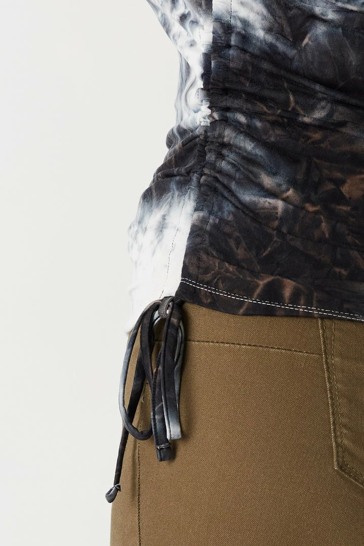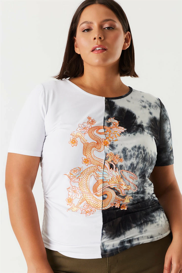 Get a slice of the splice! Get two styles in one fun tee. This t-shirt features a crew neckline, spliced colour block design, front graphic, soft material, ruched side drawstrings and short sleeves.