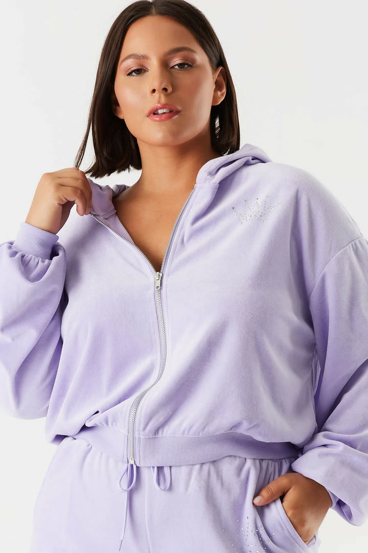 Urban Ladies Plus Plus Size Velour Rhinestone Graphic Zip-Up Cropped Hoodie Tops
